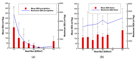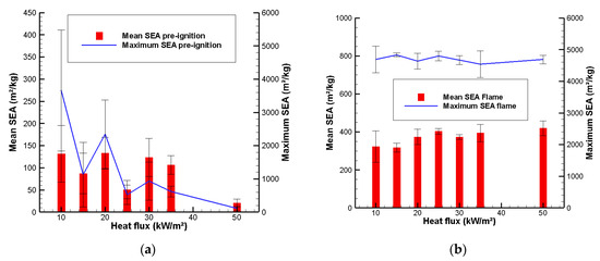 The specific extinction area, SEA, which is the ratio of the smoke production rate to the mass loss rate, is used here to compare the smoke production per unit burning mass for each phase, pre-ignition and flame. The mean and maximum SEAs for both phases are shown in Figure 8 for wood and Figure 9 for thermoplastic. For both materials, the maximum and mean SEA values follow the same trend. In addition, the SEA results are consistent with the SPR results. The higher the heat flux, the lower the time to ignition (Table 3), so for the pre-ignition phase, the duration of aerosol emission decreases as the heat flux increases. For the flame phase, the SEA increases slightly with the applied heat flux (Table 3). For thermoplastic, the maximum SEA in the pre-ignition part and the average SEA in the flame phase follow the same tendency as for wood (Figure 9a). However, in the pre-ignition part, the mean SEA varies too much to determine a variation due to the flux. For the flame phase (Figure 9b), the maximum SEA value does not vary with the heat flux. On average, the SEA of the thermoplastic is higher than that of the wood in both phases, as found in [40].
