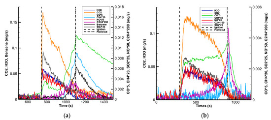 For thermoplastic (Figure 11b), CO2 is mainly emitted during the flame phase (96%), like CO (82%), H2O (58%), NO (72%), SO2 (56%) and NO (53%). The emission of CO begins after the ignition and remains almost constant during the flame phase. Just before the flameout, the CO production increases and reaches a peak at the flameout. For CO2, H2O, SO2, NO, CH4, C2H4 and benzene, the same trends are observed as for wood. Emissions of CO2, H2O, SO2 and NO increase after the ignition and reach a peak, and then decrease until complete extinction. For CH4, C2H4 and benzene, peak production occurs at the flameout; afterwards, their production drops and then stops.