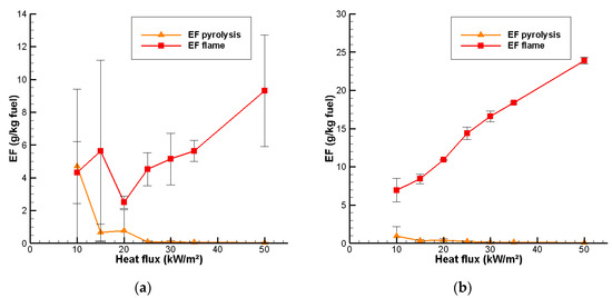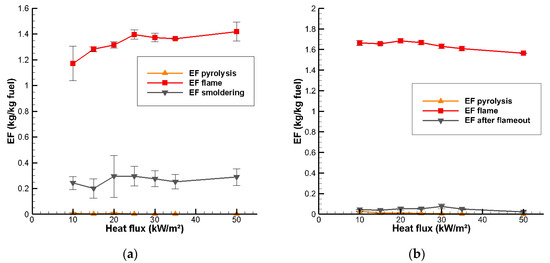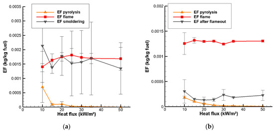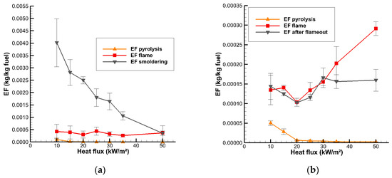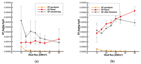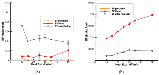 Aerosol production was calculated as described in Section 2.3. For wood, we use the values of the mass specific extinction area, σa, from the literature [35]; i.e., 3300 and 8300 m2/kg for the pre-ignition and flame phases, respectively. For thermoplastic, we calculated an average value of σa with the mass of soot collected on the filters positioned upstream of the pipes connected to the Tenax tubes (see Figure 1). The value of the mass specific extinction area obtained for thermoplastic is σa = 8320 ± 2720 m2/kg. Figure 17 displays the EF for aerosol for wood and thermoplastic samples. For the wood samples (Figure 17a), a decrease in aerosol production in the pyrolysis phase can be observed, whereas an increase occurs in the flame phase when the heat flux increases. Again, the duration of the pyrolysis phase, which decreases drastically with an increasing heat flux, is the reason for the low magnitude of EF at high heat fluxes. The same observations can be made for thermoplastics (Figure 17b). However, the presence of aerosol in the pyrolysis phase is much lower than for wood. Finally, the curve corresponding to the flame phase follows a linear increase with the heat flux.