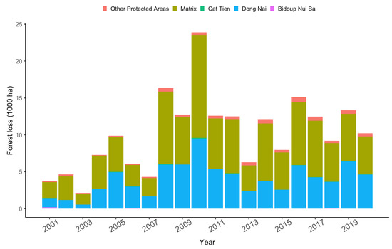 Annual forest loss averaged 9981 ha year−1, with a peak in 2010 (Figure 3). Absolute area of forest loss, and as a relative percentage of the category area, were highest in the matrix, followed closely by Đồng Nai Biosphere Reserve (Table 3). Relative to the total category area, deforestation occurred in 15.9% of the matrix, 12% of Đồng Nai Biosphere Reserve, 6.8% of the other protected areas, 1.1% of Cát Tiên, and 0.4% of Bidoup-Núi Bà (Table 3).
