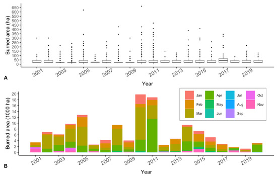 (A) Burned area of individual fires detected in our study area, 2001 to 2020. (B) Total area burned annually and by month.