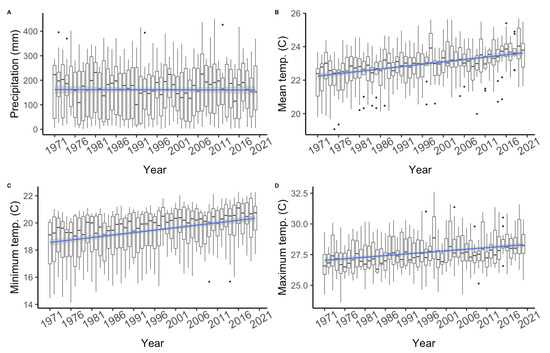 ERA5 climate data for Lam Dong, Vietnam from 1971 to 2020; (A) monthly precipitation, (mm) presented annually; (B) monthly mean temperature, (°C) presented annually; (C) monthly minimum temperature, (°C) presented annually; (D) monthly maximum temperature, (°C) presented annually.