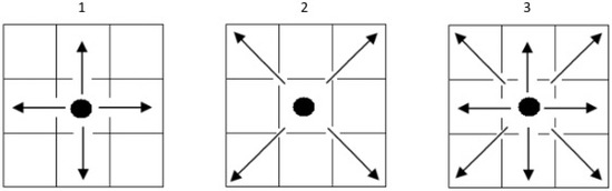 These spatial lags themselves can be defined in different ways, the most common being the “rook” and the “queen” relationships, as seen in Figure 1. The rook model takes into account the direct contact with the nonzero-length contiguity border. The bishop relation incorporates only the diagonal cross on the chessboard, representing entities which have a common vertex but no common border. Finally, the queen frame combines the rook and bishop connection models. Note that a bishop relation of order 1 always represents a rook relation of order 2, but not all rook relations of order 2 can be written as a bishop relation of order 1. Since our intention is to analyse the relevance of spatial relations to wildfire patterns at different levels, we will use the most general relationship, namely the queen contiguity model.