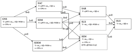 Lagrange multipliers (LM) and a portmanteau SARMA test (Spatial AutoRegressive Moving Average) are used to decide upon the most adequate one between these models [37,38,39]. Essentially, the LM statistics determines if there exists a spatial dependence by considering the spatial lag (SLM) or spatial error model (SEM), separately, while the portmanteau SARMA test involves both spatial effects simultaneously, combined into a SAC model. Thus, if all tests are significant (p-value below ), a SAC will be indicated. If one of the LM tests is significant but the SARMA test is not (or less) significant, then either an SLM or an SEM will be implemented. If all tests are not significant, then an ordinary least squares (OLS) should be run without considering spatial patterns. Note that LM tests are run also for robust error and robust lag, which should be considered if both normal LM test statistics are significant in order to decide which model to apply [40]. Figure 2 offers a more complete summary of the different steps and models, depending whether or not the null value of certain parameters is rejected.