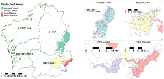 In this research, the main Galician mountain systems are studied. These are the Ancares-Caurel region in the province of Lugo, and Macizo Central, Pena Trevinca, and Pena Maseira in the province of Ourense. Figure 3 shows where these regions are located within the overall situation of Galicia, as well the all their parts that are protected as nature reserves (the coloured polygons). The total area of these four regions totals 300,413.2 hectares 128,390.4 ha which have been affected by a total of 20,216 wildfires registered from 1991 to 2019. This paper uses parishes as local entities to analyse the wildfires’ patterns and their relationship with land management. Parishes are originally religious units which are still the most useful representation of the current distribution of Galicia into small social districts, each with their own characteristic customs and lifestyles. These 232 parishes are also shown (delimited by lines) in the right-hand side of Figure 3.