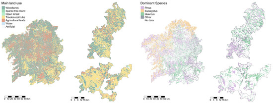 Land use (left) and dominant species (right) in Galicia and in the Galician mountain areas. (Source: MITECO, 2011 [48]).