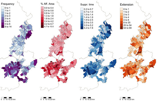 In the models with an autoregressive spatial parameter , i.e.,: for the frequency and suppression time, a correct interpretation of the coefficients implies an impact analysis. For this purpose, the total effect is calculated and split into two terms: the direct effect, and the indirect effect or spillover influence, as shown in Table 4. For the frequency variable, in all cases, the direct and indirect effects have opposite signs. However, as pointed out above, this is likely due to the interplay between the negative value of and the positive , and therefore should not be attached too much importance. The total effects, however, can safely be interpreted and compared. In particular, the strong mitigating value of the presence of industrial land stands out when compared to the other variables, which is indicative of the above-mentioned importance of economic interest and the associated models of management in fire prevention. For the suppression time, agricultural land and transitional woodland–shrub have similar mitigating effects, mainly direct. Curiously, this is also of the same magnitude (but opposite sign) as that of the ratio of protected land. Thus, if the ratio of agricultural land is increased by 1%, for example, then the average time to extinguish the fire decreases directly by 0.02 h, which is further augmented by the indirect effect which increases the reduction to reach a global effect of 0.024 h/fire. The opposite happens with the protected areas, which have a magnifying effect, both directly and indirectly, leading to a total increment of 0.02 h/fire for a 1% increase in protected areas.