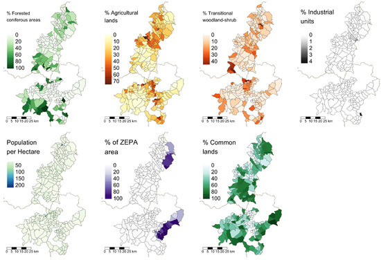 The last three independent variables are the population density, the ratio of protected land, and the ratio of common lands. The population density identifies where human dwellings are most concentrated. Protected land (in particular, protected birdlife reserve or ZEPA, which is the best-documented variable related to ecological protection in these regions) and common lands are indicative of land regulation and the role it plays in risk exposure in these mountain areas. These three variables were obtained from regional government information [47].