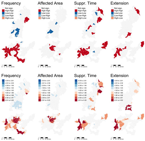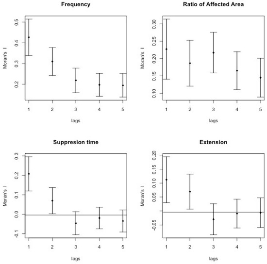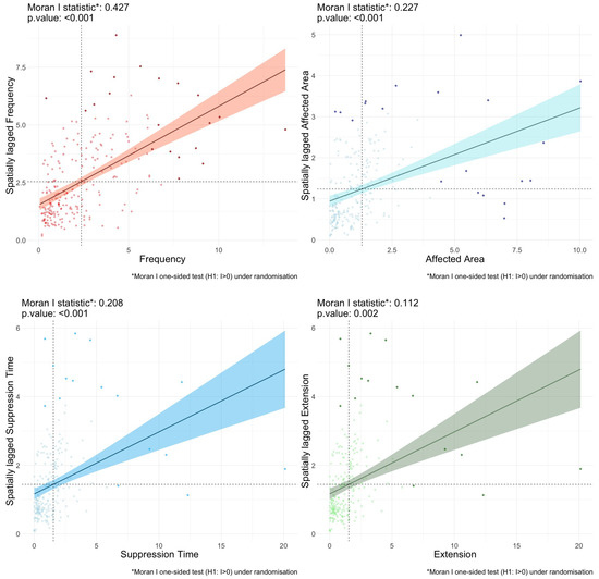 Figure 8 shows the scatter plots with the local values (horizontal) and the neighbouring values (vertical) at the optimum spatial lag, namely 1. For all variables, the relation between the local data and spatial lagged values is positive, with a relatively narrow confidence interval for the frequency, affected area, and suppression time variables. There is thus a clear positive correlation between the value of each variable at any location X and the same variable in the neighbouring locations. Note that even for the extension, where the slope is relatively flat and the confidence interval range quite wide, it still does not fall down to zero (which would be indicative of a possible absence of spatial dependence).