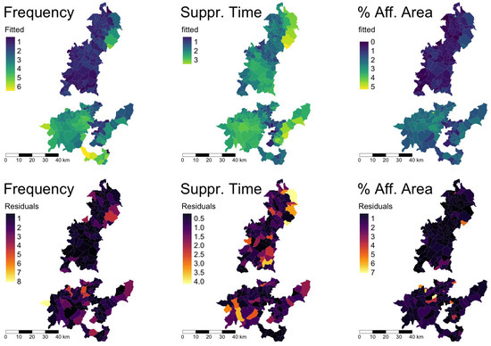 A comparison of the fitted values based on the previously mentioned results with the original data is shown in Figure 10. The upper figures show the fitted results; the bottom ones the residuals. Note that the higher concentration of frequency in the south is well captured by the model. The peak in the upper-northeast corner is correctly predicted, but its actual value is underestimated by the model, thus leading to a substantial residual. The same occurs with the frequency peak in the bottom-left corner (western part of the Macizo Central), which is also correctly identified but underestimated by the model, again leading to a substantial residual. Likewise, in terms of suppression time, the peaks in the south part of the Galician mountain system are well approximated. The more isolated regions of high concentrations in the northern part are correctly located by the model, but there are a few isolated parishes where the actual value is underestimated, thus showing high residuals. Finally, for the affected area, the prediction is in general very good, except for a few individual parishes. The presence of residual outliers (for each of the variables) is again indicative that there are additional variables beyond the ones considered here that influence the spatial wildfire patterns.