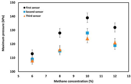 The pressure values presented in Table 2 were obtained by averaging three consecutive experiments for each methane concentration. The variation of pressures for a 12% methane concentration at distances of 2.4 m and 3.6 m from the ignition source can be attributed to complete combustion of the methane, which may happen toward the end of the pipe. The 12% methane concentration falls in the upper explosion limit (rich methane region). Hence, upon combustion initiation, part of the unburned methane is pushed out toward the end of the tube where it has sufficient time to be heated by the combustion hot gases. Therefore, the remaining methane is combusted as it travels toward the outlet, resulting in a negligible pressure rise (2 pa in this study). The pressure rise associated with each methane concentration is shown in Figure 4.