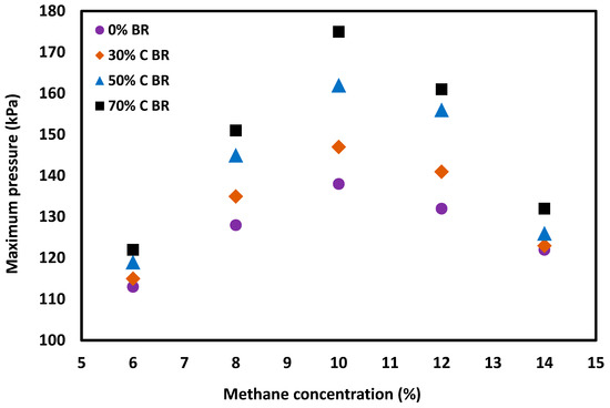 Figure 5 was developed employing the data collected from experiments for different methane concentrations, with a gradual increment of obstacle blockage ratios from 0 to 70%. In the straight tube with 0% obstacle blockage ratio (absence of obstacle), the flame propagation tube itself provides partial confinement, as described earlier. The introduction of orifice plates and the gradual increase of its blockage ratio (i.e., reducing the orifice opening) increases the confinement. Therefore, the maximum overpressure increased with the increase of the orifice’s blockage ratio, a finding that is in agreement with the relevant literature [16]. It is well known that stoichiometric methane–air mixtures (9.5% methane in air) generate the highest deflagration pressures when compared to lean and rich methane–air mixtures [23,24]. Lean and rich methane–air mixtures are those in which methane percentages are lower and higher, respectively, than they are under stoichiometric conditions. As shown in Figure 5, for the experiment with 6% and 14% methane concentrations, the influence of the orifice plates on deflagration overpressure was considerably low. However, that influence increased significantly for experiments at a 10% methane concentration (close to stoichiometry) in the employed apparatus.