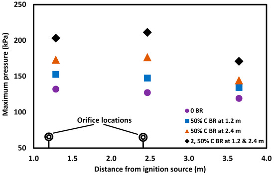 The location and number of obstacles that influenced the deflagration overpressures are shown in Figure 6. Increasing the number of obstacles is expected to increase the maximum deflagration overpressure due to the increase of confinement; however, even the position of a single orifice was found to have an impact on the deflagration overpressure. For example, when an orifice plate with a 50% blockage ratio was moved from 1.2 m to 2.4 m from the ignition source along the length of tube, all pressure transducers exhibited elevated deflagration overpressures (see Figure 6). In this case, when the orifice plate was moved outward from the ignition source, the gas volume from the ignition point to the orifice plate was increased, providing a higher level of confinement. The flame area increased with this movement, causing a faster burning rate, as well as higher flame propagation speed and overpressure. Therefore, the deflagration overpressure increased when the position of the orifice plate was located further from the ignition source: in this case, located at 2.4 m instead of 1.2 m from the source of ignition.