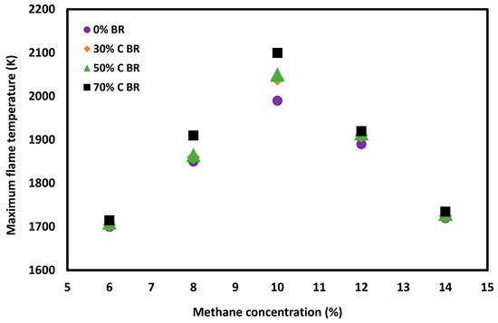 The propagation of the flame has a significant impact on flame temperature, which is why the flame temperature was measured at the position of the ignition source. Table 1 provides a set of data to demonstrate the difference between the adiabatic flame temperature and the experimentally obtained flame temperature. The experimental setup in this study was not confined, meaning it was open at one end. Therefore, heat was transferred via convection, conduction, and radiation and/or discharged via the hot gas at the pipe’s outlet. This resulted in a considerable difference between the theoretically calculated adiabatic flame temperature and the experimentally measured flame temperature. The deviation of the flame temperature between adiabatic and experimentally obtained values suggests that the flame temperature is largely dependent on confinement. Another factor impacting the deviation of the flame temperature is the concentration of methane. The deviation of flame temperature increased as the methane concentration was increased from 6% towards the stoichiometric condition (~9.5% CH4), then decreased. At the stoichiometric condition, the flame temperature reaches a maximum; however, the convective heat transfer due to the flame propagation is also high due to the higher flame speed. Thus, the maximum deviation of the flame temperature occurs near stoichiometric methane–air mixtures.