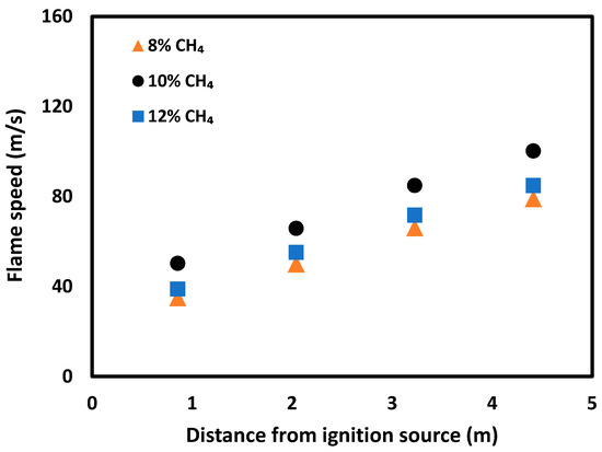 Figure 8 presents the flame propagation speed for 8%, 10% and 12% methane concentrations when no obstacles were applied. The 10% methane concentration showed higher flame propagation speeds along the length of the tube when compared to 8% and 12% methane concentrations (lean and rich mixtures). This finding agrees with the current literature [21].