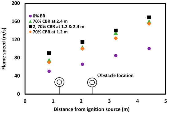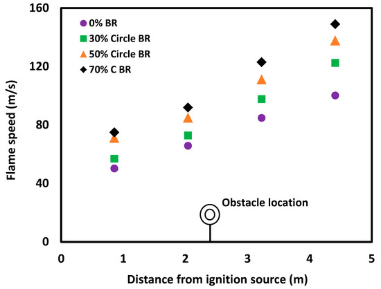 The presence of obstacles in the straight tube generates vortices, as previously discussed [8]. Interaction between the tube wall and the generated vortices result in significantly enhanced turbulence. As the blockage ratio of the orifices increases, there is a further increase in the formation of vortices and wall interactions, producing a correspondingly higher level of turbulence. More turbulence leads to an increase in burning rates, which then results in an increase in flame propagation speed. The relationship between flame propagation speed and the blockage ratio of obstacles is reflected in Figure 9. The flame speed was measured at four points along the length of the glass tube, with each point representing the entrance of the flame into the flange. The time of entry was recorded by the high-speed camera. As the flame moves toward the end of the tube, the flame speed increases due to the production of higher turbulence. This phenomenon is intensified by the application of obstacles with larger blockage ratios. The variation in flame speed, shown in the error bars, is likely due to slightly different experimental conditions, or random and systematic errors.