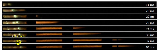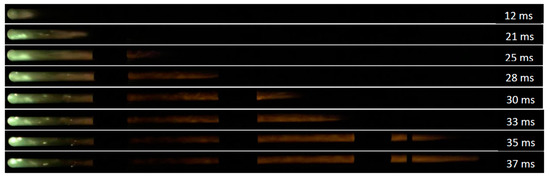 Eight sequential images have been presented in Figure 11 to illustrate 10% methane–air flame propagation in the straight tube. Figure 12 demonstrates 10% methane–air flame propagation when the tube included a 70% orifice plate positioned 1.2 m from the ignition source. In the second half of the tube, the flame front arrival time was reduced. As previously discussed, flame distortion occurs when obstacles are introduced and a higher level of turbulence is generated. The elapsed time for flame propagation is therefore reduced for experiments with obstacles when compared to experiments without obstacles. A 3 ms reduction of flame elapse time (from 40 ms to 37 ms) was observed when an obstacle was placed in the flame propagation tube at 1.2 m from the ignition source.