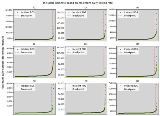 RFWs and FWWs are exclusively intended for conditions conducive to extreme fire behavior. Consequently, the focus of this analysis was to categorically demonstrate the severity of the most destructive large fires using a matrix methodology still applicable in daily operational forecasting. Maximum rates of spread were separated by state and graphed in ascending order, yielding the relationships demonstrated in Figure 2. Here, we further excluded all but the most extreme examples of fire behavior by selecting only those incidents occurring on the right side of a breakpoint, plotted to signify the point at which rates of spread start rapidly increasing. These breakpoints were obtained using an analytical method developed in Python specifically designed to find the knee or elbow of curves by calculating the slope of a line drawn from the minimum to maximum value, rotating the data so that the slope of this line is zero, and then finding the minimum value of the rotated data, corresponding the inflection point of the curve [38].