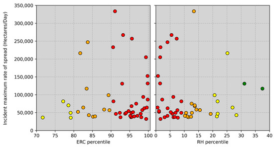 Additional analysis concerning the frequency of agreement between ERC and RH percentiles demonstrated that ERC and RH scores agreed 50% of the time throughout all sampled incidents, ERC and wind speed 20%, and wind speed and RH 23%. This is reasonable given the incorporation of RH into the calculation of ERC [46], though it is worth noting a lack of agreement 50% of the time, demonstrating independence between RH and ERC (i.e., cases with high ERC but low RH scores which still result in increased rates of spread and vice versa). Occasionally incidents occurred at very low scores for one or more variables (i.e., RH percentiles above 40, wind percentiles below 20, etc.). These outliers were not excluded from the analysis to highlight where fire behavior did not perfectly align with weather/fuel severity given the occasionally stochastic nature of wildfires. Notably, 72% of the time ERC and RH scores agreed both variable scores were 5, demonstrating strengthening alignment as conditions become more severe.
