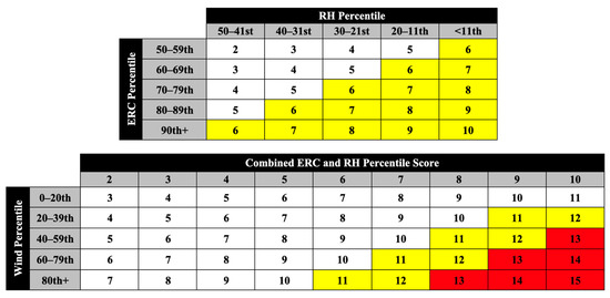 Categorical scores for percentiles of ERC, RH, and wind speed as a two-step decision matrix. Yellow boxes correspond to scores that suggest a warning may be necessary; red boxes indicate more severe conditions.