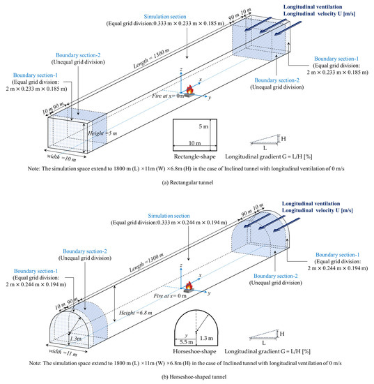 The rectangular tunnel and horseshoe-shaped tunnel were used in the CFD analysis in this study. The rectangular tunnel is 10 m in width and 5 m in height; the horseshoe-shaped tunnel is 11 m in width and 6.8 m in height. The equal grid division region for the simulation space is considered as 1300 m in length and is part of a several-kilometers-long tunnel. However, in the case of the inclined tunnel with 0 m/s (U), we consider that longitudinal gradients would cause the smoke layer to spread unequally on the two sides; thus, we extended the simulation space to 1800 m in this case. The tunnel slopes are varied at 0%, 2%, and 4%.