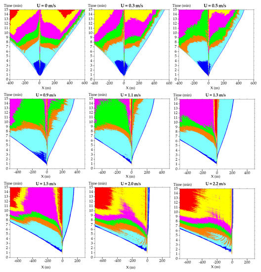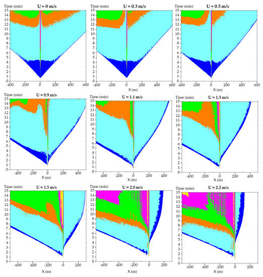When U < 1.1 m/s, SE level 3 (in orange) begins to spread to the upstream side after 10 min, and SE level 4 (in green) begins to spread after 12 min. From U ≤ 0.5 m/s, SE level 5 (in purple) begins to spread to the upstream side after 10 min. When U = 0.5 m/s, SE level 6 (in yellow) rapidly spreads to x = 300 m upstream at t = 14 min. When U = 0.3 m/s, SE level 6 (in yellow) occurs earlier (in 12 min) and spreads to x = 400 m upstream at t = 15 min. When U = 0 m/s, SE level 7 (in red) occurs at the location of x = 350 m upstream at t = 13 min and then spreads to x = 300–500 m in 15 min. The tendency of upstream smoke to descend toward the road surface starts away from the fire point and spreads gradually. When U = 0 m/s and 0.3 m/s, it can be found that SE level 5 (in purple), level 6 (in yellow), and level 7 (in red) rapidly expand to x = 400–500 m after 9 min, indicating that the risk of serious injury and death after 10 min is great in the area near the fire point.