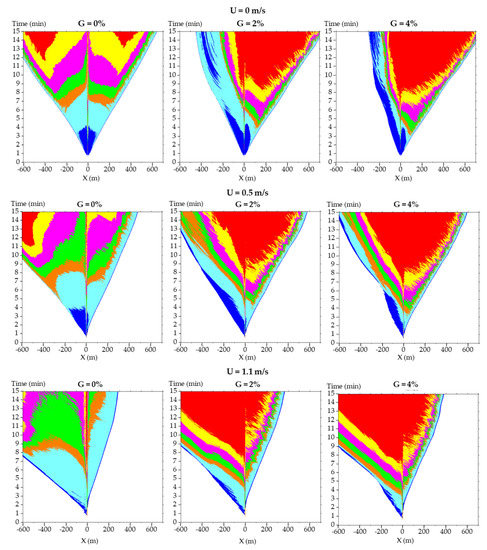 When U = 0.5 m/s, it is observed that the range of each SE level is moved upstream in cases where G = 2% and 4%. The area suffering the hazards of SE levels 1–3 is larger than that in the case of U = 0 m/s with G = 2% and 4%; however, the area suffering the hazards of SE levels 4–7 is similar to the case of U = 0 m/s with G = 2% and 4%.