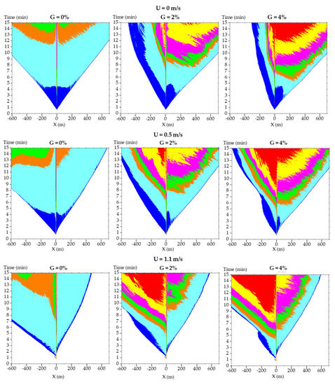 When U = 1.1 m/s, the range of SE levels 3–5 spreading upstream increases with the gradient increase to G = 4%. SE levels 6 and 7 did not occur upstream in the case of G = 2% but SE level 6 appears when the gradient increases to G = 4%. Hence, concerning higher gradients, the smoke descent of SE levels 6 and 7 (shown as yellow and red areas in Figure 8) commences earlier and spreads wider both upstream and downstream.