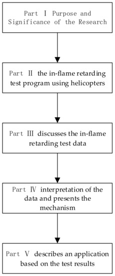 This paper consists of the following sections: Part I provides an overview; Part II describes the in-flame retarding test program using helicopters; Part III discusses the in-flame retarding test data; Part IV provides an interpretation of the data and presents the mechanism; Part V describes an application based on the test results; and Part VI is a summary, as shown in Figure 1.