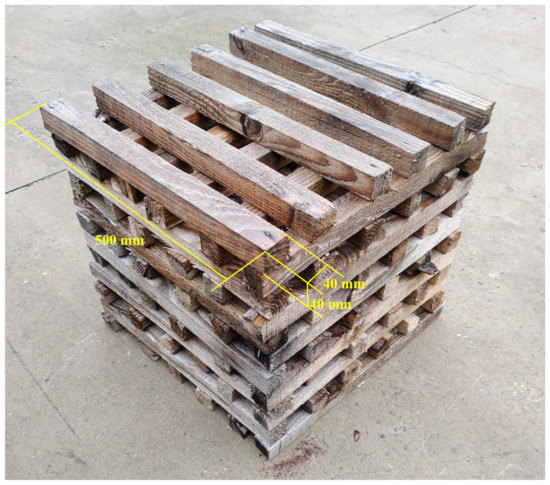 Wood cribs are often used for various tests requiring repeatable combustion temperatures, such as fire-extinguisher performance (ANSI/UL 711) [26,27]. Each crib was made of 1A wooden strips that were 40 mm × 40 mm × 500 mm in size, as stipulated in GB4351.1-2005 Portable Fire Extinguishers. The pine species Pinus massoniana Lamb was selected as the raw material for the wood strips. The size and layout of wood crib were all consistent with the literature [28] and are not described in detail in this paper and the 12-layer wood crib was shown in Figure 2.