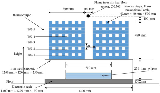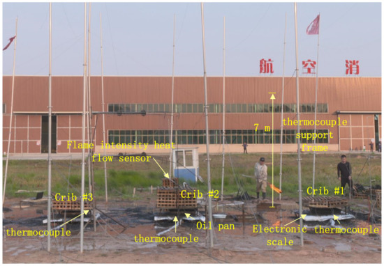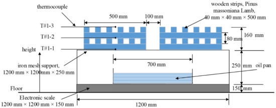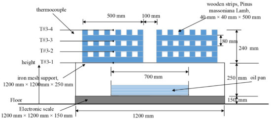 The wood crib combustibles were placed on an iron mesh support that was 1200 mm × 1200 mm × 250 mm in size, and the ground under the wood crib combustibles was laid out with square fuel-oil basins that were 700 mm × 700 mm × 100 mm in size. Four liters of blue high-42 octane Avgas 100# aviation gasoline was used as the ignition fuel.