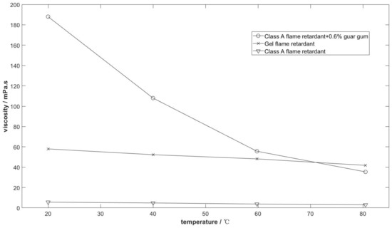 The viscosities of Agent#3, Agent#4, and Agent#5 were tested and curves of the viscosity values for the fire extinguishing agents as a function of temperature were obtained, as shown in Figure 7. The viscosity of Agent#5 which mixed with guar gum decreased with the increase in temperature. The viscosities of Agent#3 and Agent#4 fire extinguishing agents without guar gum hardly changed with the increase in temperature. When the temperature of the Agent#5 fire extinguishing agent was lower than 20 °C, the viscosity of the fire extinguishing agent reached 190 mPa.s, but the viscosity dropped sharply when the temperature of the fire extinguishing agent was between 40 °C and 60 °C. When the temperature of the fire extinguishing agent reached 60 °C, its viscosity dropped to 55 mPa.s. It can be seen that the viscosity of Agent#5, when mixed with guar gum, was very sensitive to temperature.