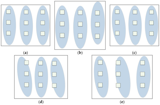 Coverage areas for each retardant agent dropped from the helicopter: (a) Agent#1, (b) Agent#2, (c) Agent#3, (d) Agent#4, and (e) Agent#5. Crib#1, Crib#2, Crib#3 from top to bottom.
