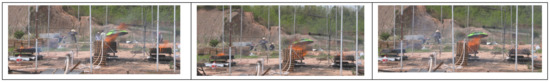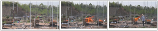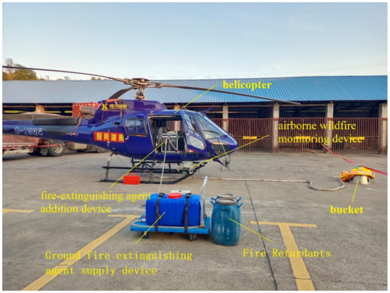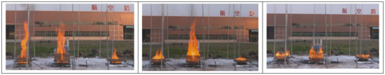- The helicopter carried the bucket fire extinguishing device to spray the flame-retardant water agent on the wood cribs three times at a speed of 20 km/h and at a height of 32 m, as shown in Figure 8;