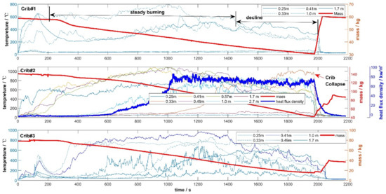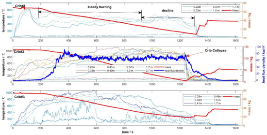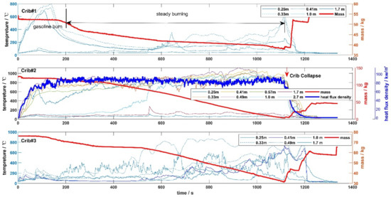 The data measured by the thermocouples and radiant heat flux density meter after the collapse of the wooden crib was no longer the measurement value of the assumed position in the design plan so ground water pipes were used to extinguish the residual fire associated with the wooden cribs after their collapse. At this time, the temperatures of the Crib#1, Crib#2, and Crib#3 fires decreased rapidly, their quality increased rapidly under the effect of water spraying from the ground, and their data was of no practical significance. However, due to the limited number of test personnel, when ground water pipes were used to extinguish the residual wood crib fire, water was not sprayed on Crib#1, Crib#2, and Crib#3 fires at the same time. This resulted in a rapid drop in temperature and a rapid mass increase at the three fire sites that did not occur at the same time. This is reflected in the subsequent analysis charts.