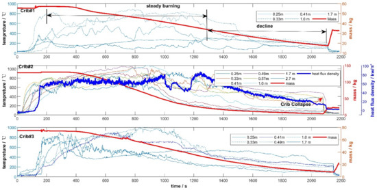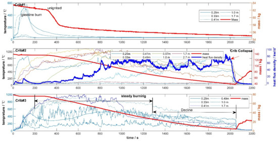 The mass loss, radiant heat flux density, and temperature change curves for the crib without any flame-retardant water agent are shown in Figure 10. The change curves for temperature, radiant heat flux density, and the mass of the wood cribs are represented by three subgraphs. The three subgraphs from top to bottom represent the changes process for Crib#1, Crib#2, and Crib#3, respectively. The maximum mass loss refers to the average value of the mass loss over 5 consecutive seconds, and the average value of the radiant heat flux value refers to the average value of the radiant heat flux density of Crib#2 from the burnt of the oil to the collapse of the wood crib. This was to avoid the influence of any mutation values caused by interference factors during the data acquisition process. It can be seen from the mass loss, radiant heat flux density, and temperature curves that after the pilot oil pan was ignited, the 100# aviation gasoline in the oil pan and the wood crib started to burn violently, releasing large amounts of heat. The temperature and radiant heat flux density curves increased rapidly and the quality gradually decreased, reaching a peak at about 90 s. After about 180 s, as the pilot fuel in the oil pan was consumed, the temperature measured by the thermocouples at all heights dropped and the wood crib entered the free combustion stage.