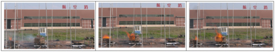 Three cameras were used during the test. Two were vertical to the fire field. Their short focal length lens was used to record whether the area covered by the flame-retardant water agent completely covered the three wood cribs in the flight direction. The long focal length camera and was used to record the combustion process after the flame-retardant water agent was sprayed on them. The third camera was parallel to the fire field to record whether the agent sprayed on the area completely covered the wood cribs in the perpendicular direction to the flight.