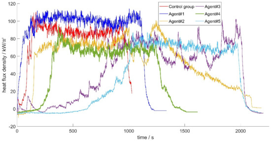 - The gel flame-retardant water agent has good water absorption performance and poor fluidity, which means that that the water utilization rate is high. The principle consists of two components: One is that super absorbent particles absorb water (hundreds of times their own weight) in a chemical-physical process called hydration. The stacked and water-filled “bubbles” greatly enhance the thermal protection performance of the flame-retardant water agent. The second one is to prevent the flame-retardant water agent from turning into steam in the superheated air above the wood crib fire and being taken away by the high-temperature smoke plume gas. The adhesive properties of the gel-based Agent#3 slow down the evaporation process, enabling more product to reach the fire source through hot air [32]. These two aspects need to be taken into account when gel flame retardant is sprayed from a helicopter. When the amount of flame-retardant water agent is less than that required for fire retardant (that is, the fire field intensity is large, for example, with the 12-layer wood crib when it is still fully burning after the flame retardant has been applied), the fire retardant performance is poor because the gel-based Agent#3 cannot cover all the burning points. When the amount of flame-retardant water agent is sufficient relative to the fire retardant requirements (that is, the intensity of the fire field is small; for example, a 4-layer wood cribs cannot be ignited after the flame retardant has been applied), a colloid can form on the surface of the wood strip that wraps around it to prevent the combustibles from being ignited. If there is not complete coverage (100%) on all surfaces, then gels are useless as the exposed area can catch fire and burn right through a structure. Therefore, helicopters should spray more gel flame retardants to cover the surface of combustibles as much as possible. A ground coating should be used as far as possible to protect wooden structures and improve helicopter spraying efficiency at reducing the intensity of the fire field;