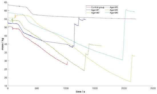 It can be seen from Table 3 that the weight increases due to the Class AB flame retardant and the gel flame retardant are larger than those for the other flame-retardant water agents and more of the flame-retardant water agents are absorbed. This is mainly related to the active ingredients in Class AB flame retardants. The flame-retardant water agent can quickly penetrate the surface of the wood crib and enter the interior. The gel flame retardant has poor fluidity, good adhesion performance, and can adhere to the surface of the wood crib. Therefore, the loss of the flame-retardant water agent with gel is less than that of other flame-retardant water agents.