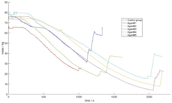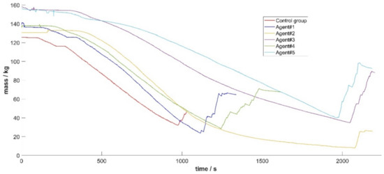 Direct burning was performed on the surface of the wood crib where no spraying flame-retardant water agent was applied, and the mass loss, temperature, and radiant heat flux were measured after the wood crib was ignited. This treatment was the control group and was used to compare the differences in the parameters after helicopter spraying the flame-retardant water agents listed in Table 2.