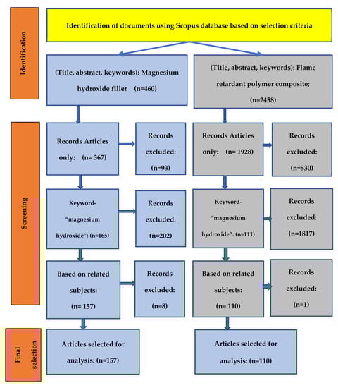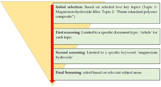 The surveying approach used in this study for article selection and processing is illustrated in Figure 1. Four steps are used for research article selection and processing from the Scopus database. In the first step, two key topics (Topic 1-‘Magnesium hydroxide filler’, Topic 2-‘Flame retardant polymer composite’) are used to obtain all the relevant published documents. The first screening is carried out in the second step to limit the specific document type on each topic and to identify the relevant articles.