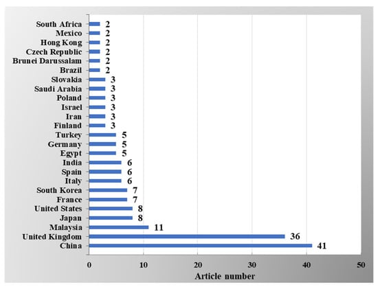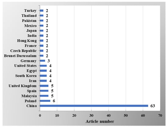 During the survey of Topic 1—“Magnesium hydroxide filler”, a total of 157 articles were selected, which were published by 38 countries (based on the affiliation of all authors mentioned in 157 articles). The analysis shows that at least two or more research articles were published based on “Magnesium hydroxide filler” from 25 countries, as shown in Figure 4. It can be noticed that China is the most advanced country in the research on “Magnesium hydroxide filler” and published 41 articles. The United Kingdom (UK) is the second country, which published 36 articles. Almost 50 percent of the 157 articles were published by researchers from China and the UK. Other countries also conduct research frequently, for instance, Malaysia, Italy, Japan, the United States, France, and the Republic of Korea. The connectivity of the co-authored countries is illustrated in Figure 5. It is evident that there is strong collaboration among some specific countries, which are: the United Kingdom, China, Malaysia, the United States, Turkey, and India, and, as a consequence, the publication rate from these countries is also higher in Topic 1.