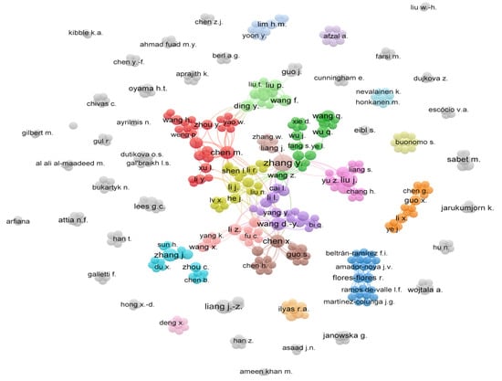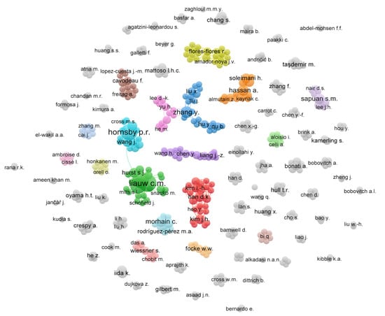 The network connectivity of the authors based on the articles published by 20 countries is presented in Figure 12. It is clear from the network connectivity of the authors that there is a significant contribution on this topic from the different author groups. Several authors collaborate with others, as illustrated by different clusters in Figure 12. The top ten authors who have published articles on the topic of “Flame retardant polymer composite” are listed in Table 6 based on the publication numbers, including their citation numbers, h-index, and country of origin extracted from the Scopus database.