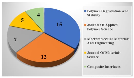 The top journals that published at least 4 articles in this topic are shown in Figure 13. It is evident that Journal of Applied Polymer Science, Polymer Degradation and Stability, and Fire and Materials are the profound journals in this topic.