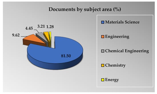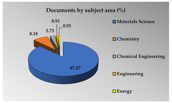 The mapping of the subject areas of the 109 selected articles is also carried out for Topic 2 and presented in Figure 15. The majority of articles (87.26% out of the selected 110 articles) are related to the material science subject, whereas the chemical engineering area includes 8.18% of the documents (9 articles). Both the chemistry and engineering areas contain 2.73% (3 articles) and 0.91% (1 article) of the selected articles, which is reflected in Figure 15. It can be noticed that most of the works are under material science, and some are under chemistry.