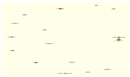 The country-wise publication is analysed in this study. It is noticed that there are 29 countries that have published at least 1 or more articles on Topic 2—"Flame retardant polymer composite". Figure 10 shows the list of 20 countries that have published at least 2 articles. Among those, China conducted a lot of research on the flame retardant polymer composite containing magnesium hydroxide as filler material and published 63 articles out of 108 selected articles. The rest of the countries published less than 10 articles. The United Kingdom and the United States also published five and four articles, respectively. The country-wise co-authorship is represented in Figure 11, where it can be noticed that there is no collaborative network cluster except for the cluster of the United Kingdom, China, and the Republic of Korea.