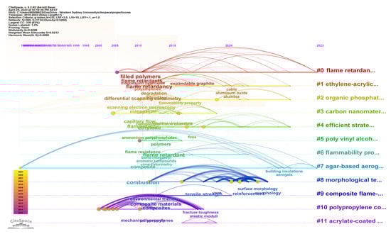 The mapping of keyword co-occurrence is analysed for Topic 2. The keywords timeline visualisation is illustrated in Figure 14 from 2010 to 2023. The analysis of keyword co-occurrence among 110 articles extracted from the Scopus database was conducted using CiteSpace software to represent the keywords timeline network. There was also a total of 12 clusters, and the keywords are illustrated similarly as in Section 3.1.3 in Figure 8. The topmost cited (at least 15 citation counts) keywords among the selected 110 articles in Topic 2 are presented in Table 8. Magnesium hydroxide, magnesium compound, and flame retardants are the most cited keywords based on this topic. It is evident that, recently, several filler materials were added in the polymer composite along with magnesium hydroxide. For instance, black carbon, carbon fibres, expandable graphite, carbon nanotubes, and organic natural fibres are getting attention, which can be seen in Figure 14.