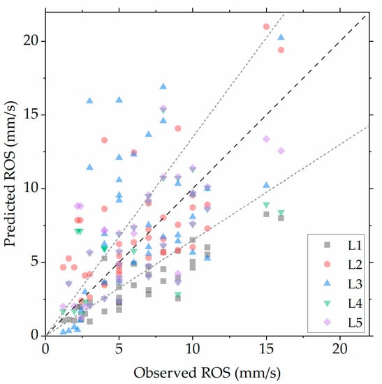 In Figure 1, ROS predictions of the five laboratory-developed models are compared against the respective measured values, obtained in the 37 fire tests performed in quiescent conditions; the bold dashed line corresponds to “perfect agreement”, whereas the normal dashed lines represent the ±35% “acceptable” error intervals, as proposed in [4]. In general, the under-prediction of the measured ROS values is undesirable, especially when the respective model is used in actual operational environments. It is evident that the obtained predictions exhibit significant scatter; however, the majority of the predicted values lie within the ±35% error region. The L1 model shows a tendency for under-prediction, while the L2 model exhibits a slight tendency for over-prediction. The L3 model under-predicts the measured ROS values in the low region (R < 2 mm/s). Models L4 and L5 demonstrate relatively good prediction qualities.