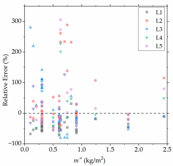 Aiming to investigate the potential impact of certain physical parameters on the prediction quality of the investigated ROS models, the relative error of the predicted values is presented in Figure 2, as a function of the (dry) fuel load (m″) for all the considered test cases. It is evident that the scatter of the predicted values is reduced with increasing fuel load, thus suggesting high sensitivity of the ROS models to relatively low fuel load values. Among the five ROS models, the L3 model exhibits higher sensitivity in low m″ values, thus resulting in the relatively high error values reported in Table 1.