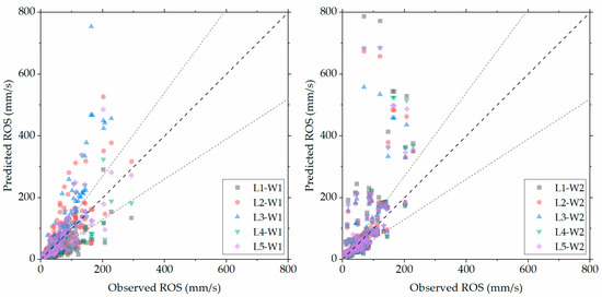 Comparison of measured ROS values for the 166 wind tests against predicted ROS values using the two “wind correction” sub-models (W1: left; W2: right), applied to the five laboratory-developed models.